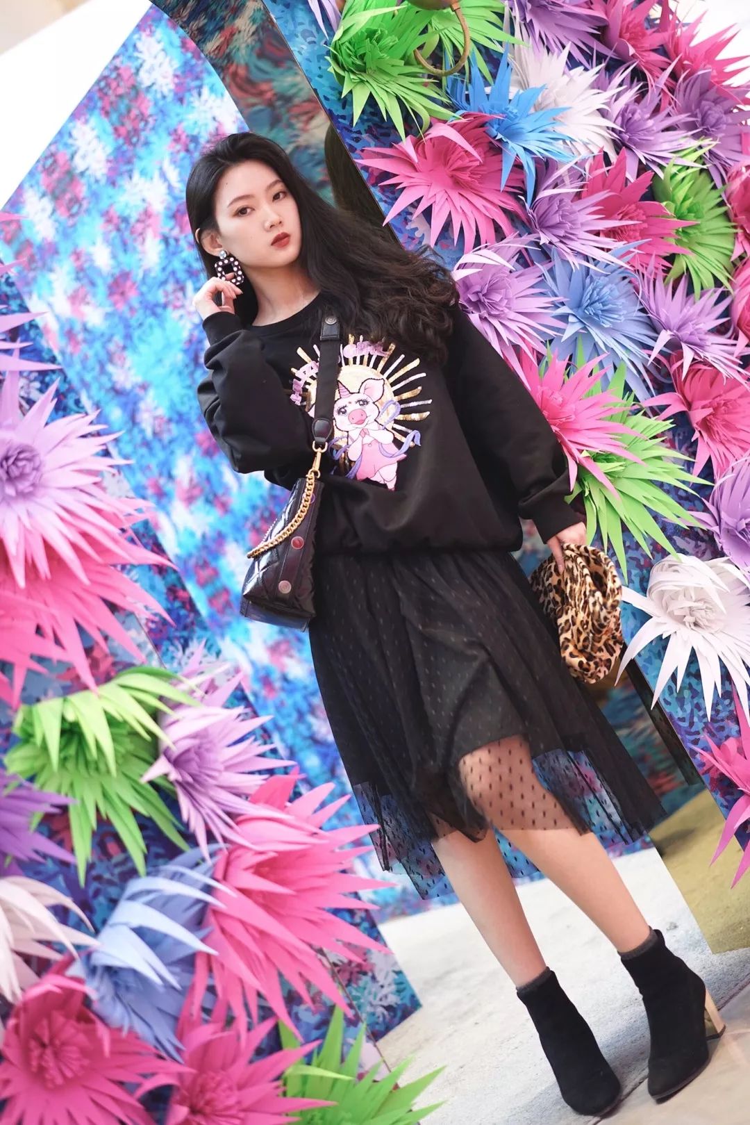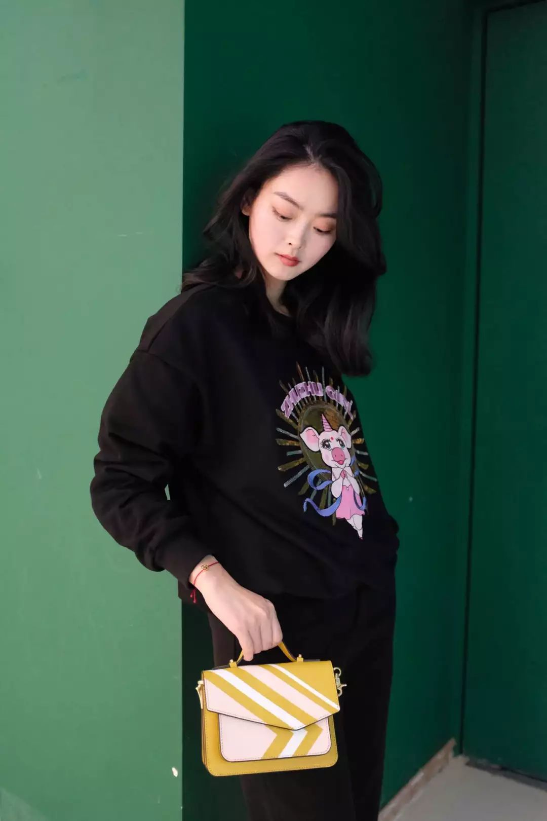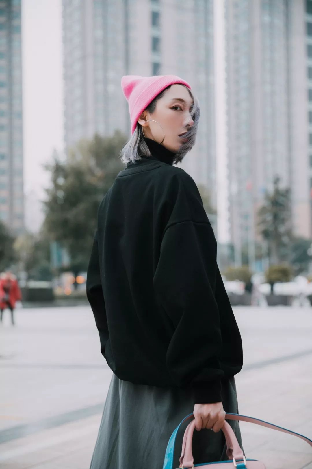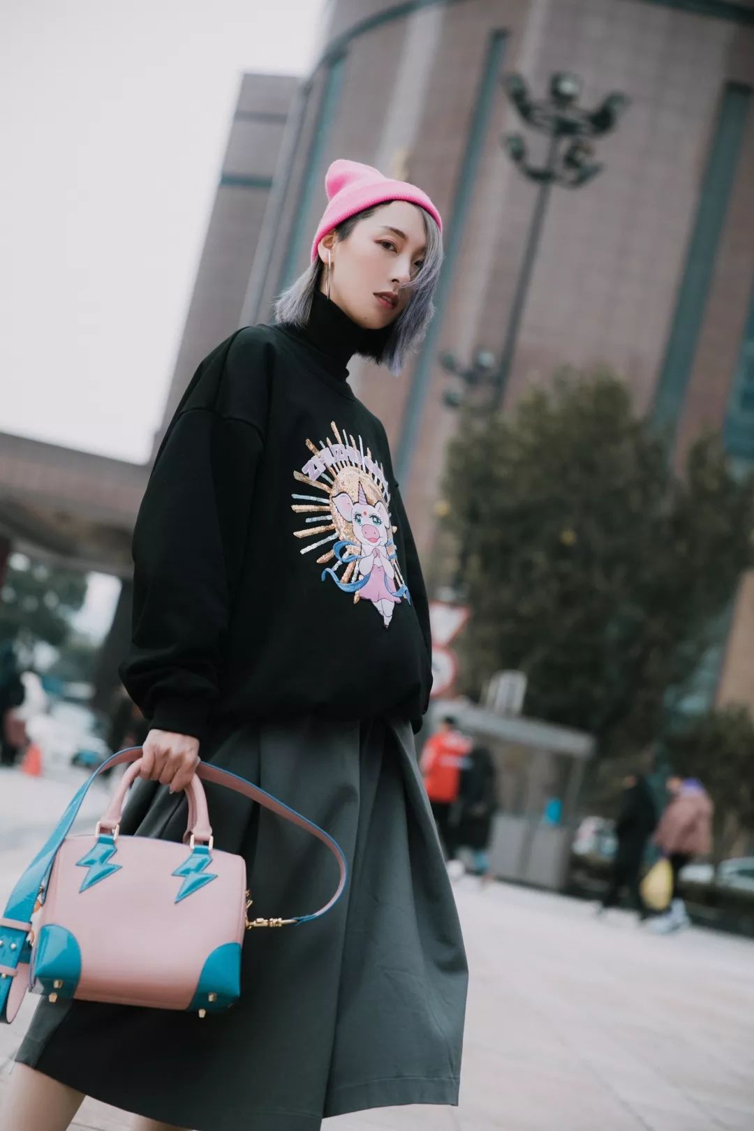 粉蓝撞色,是黑色卫衣酷女孩儿!