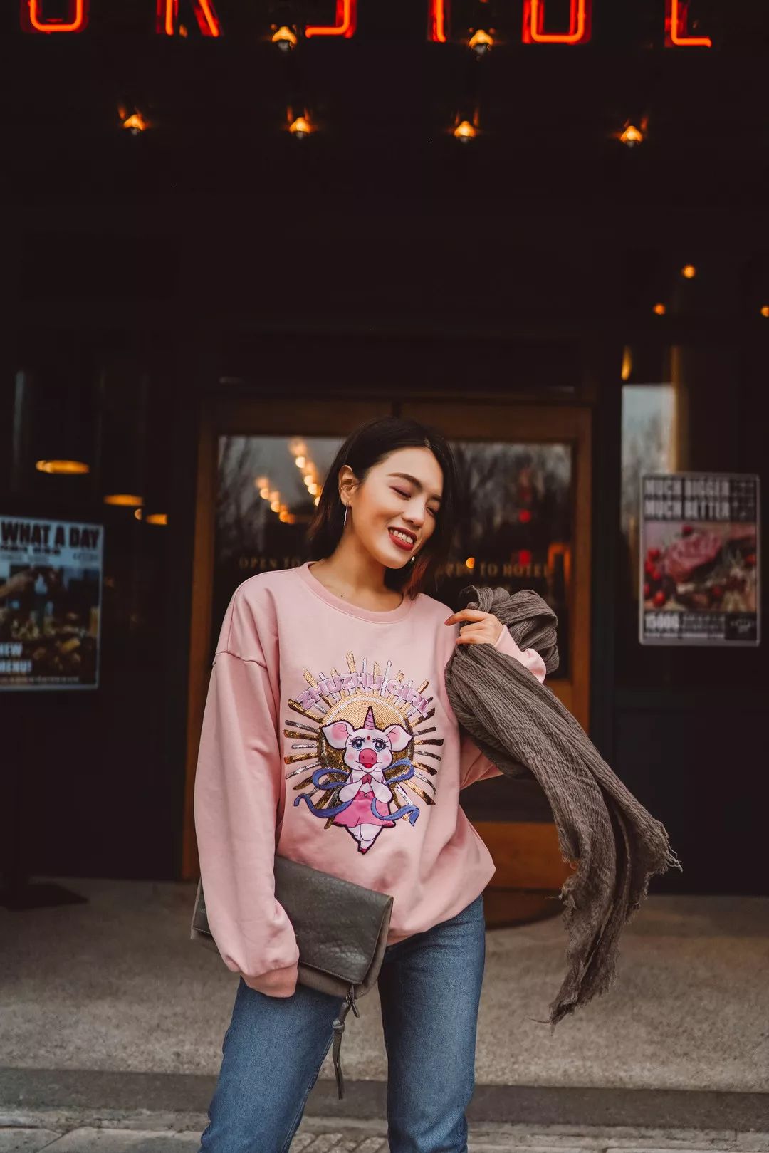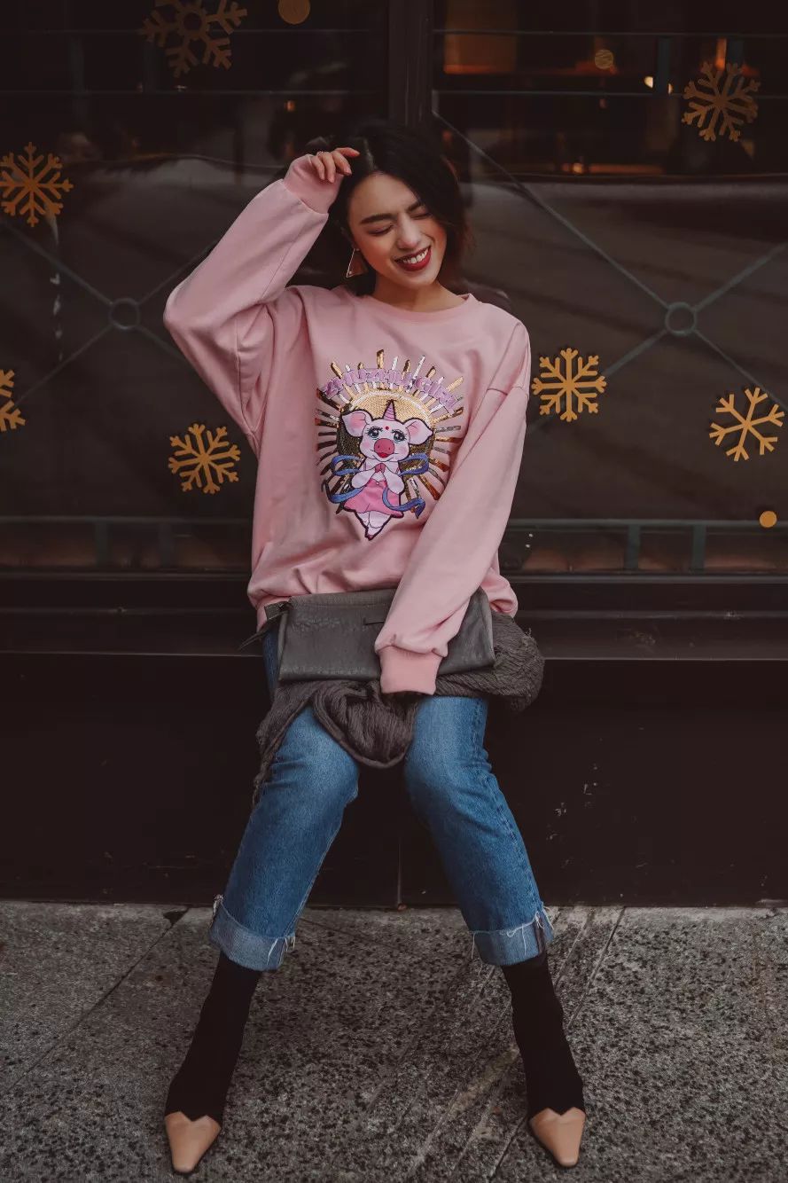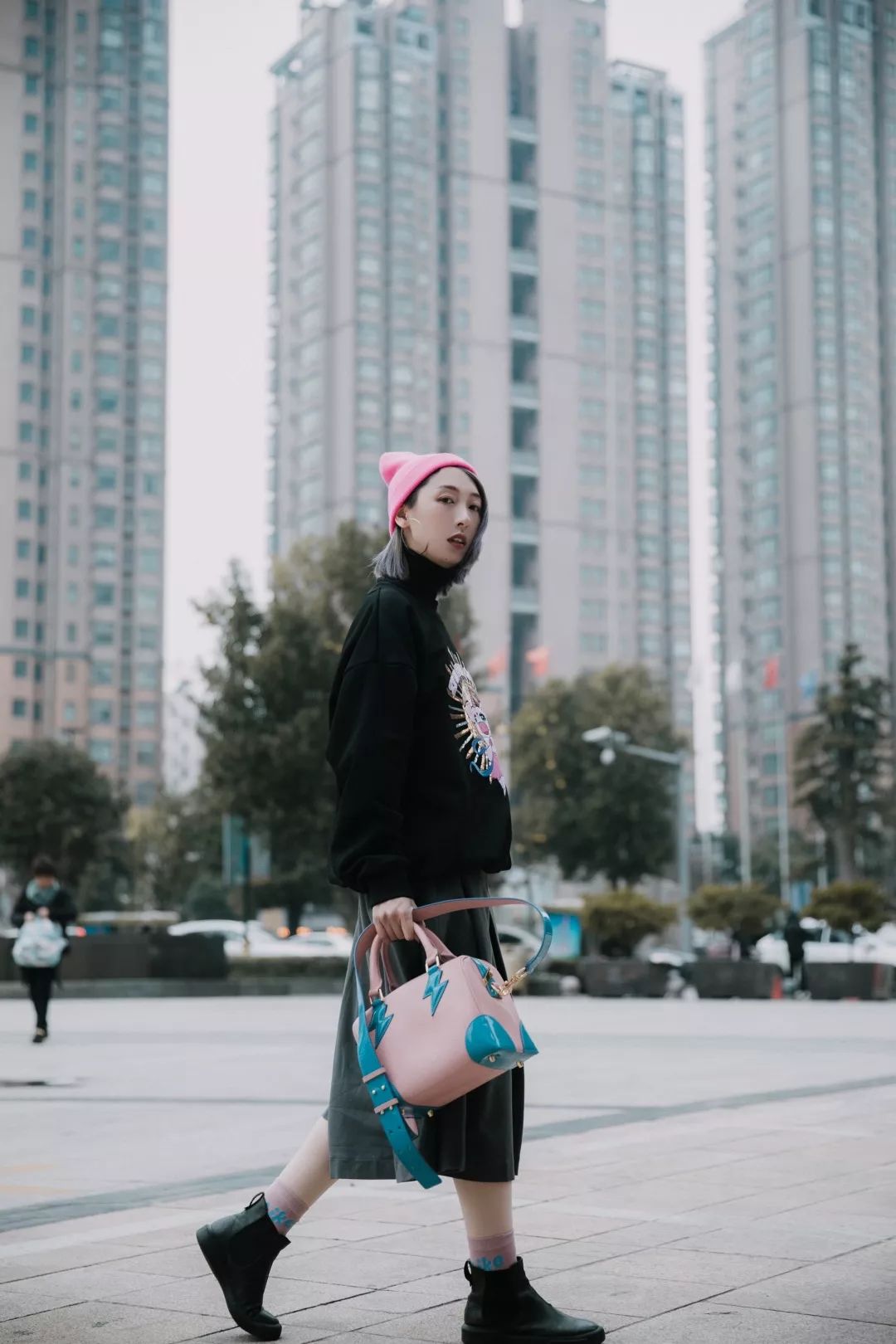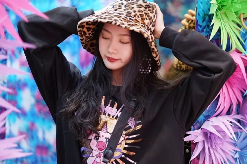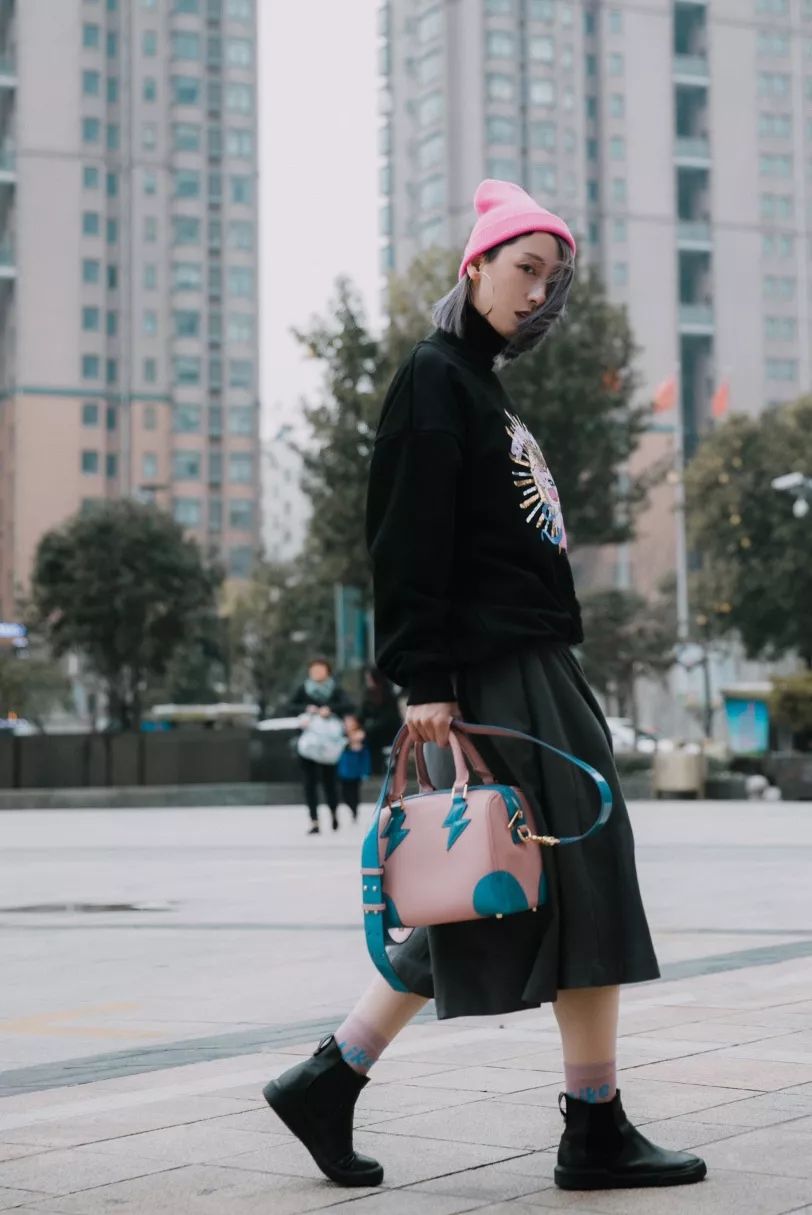 粉蓝撞色,是黑色卫衣酷女孩儿!
