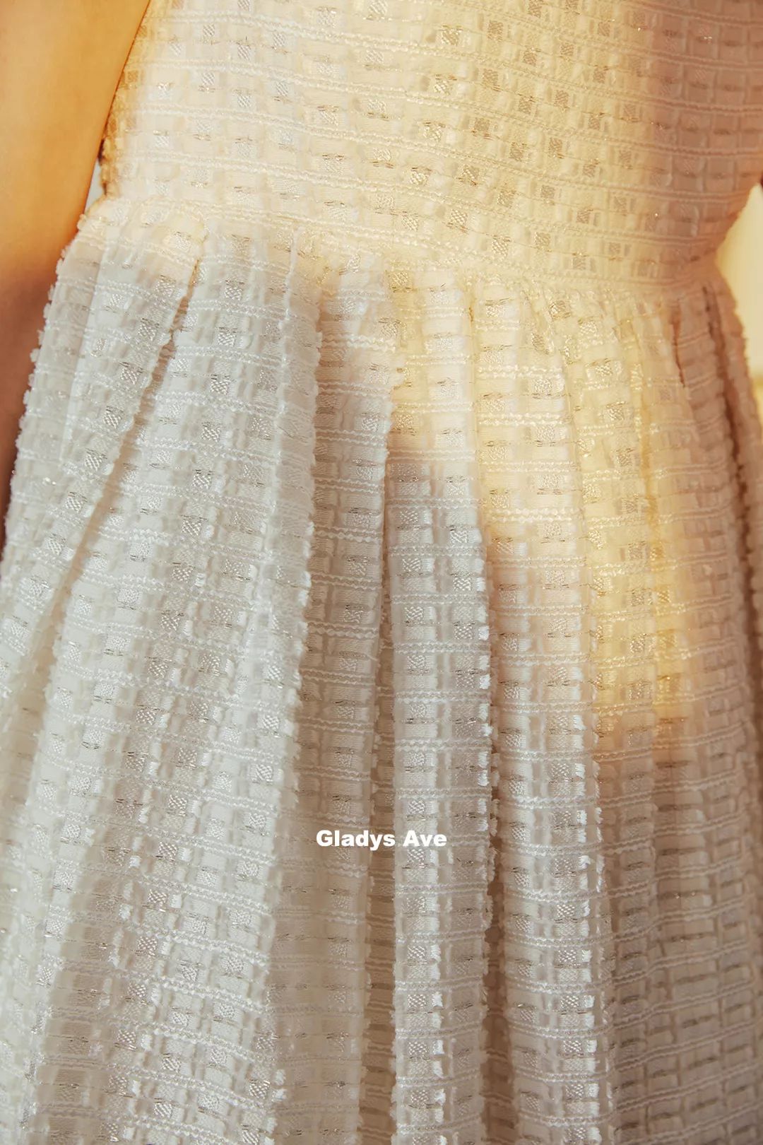 白色一字肩吊带上衣/连衣裙,使用进口提花面料,每一个花朵都是立体的,肌理感很强。