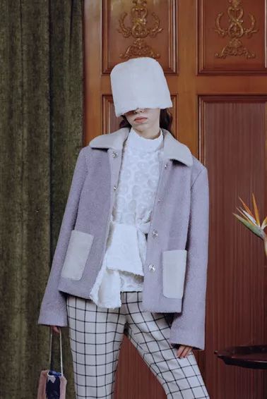 薰衣草紫的羊羔绒拼色短夹克