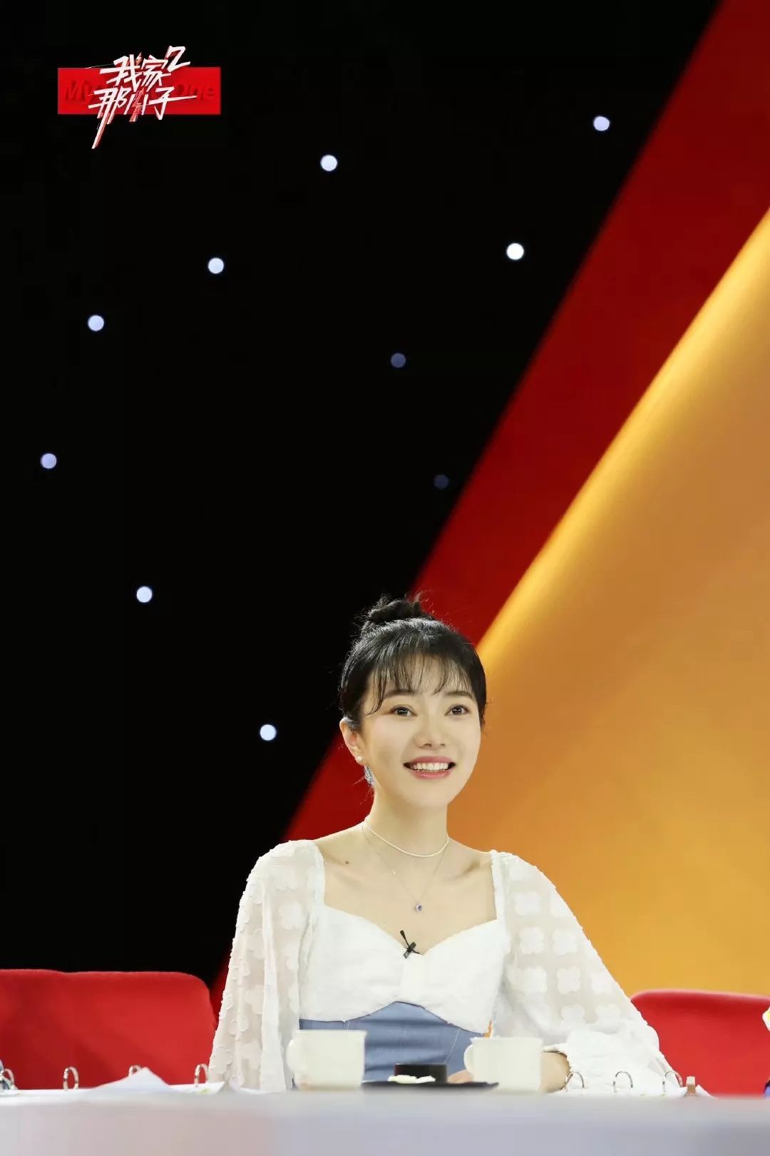 欣然身着蓝白拼接连衣裙主持《我家那小子》