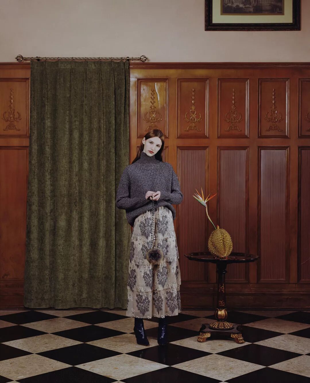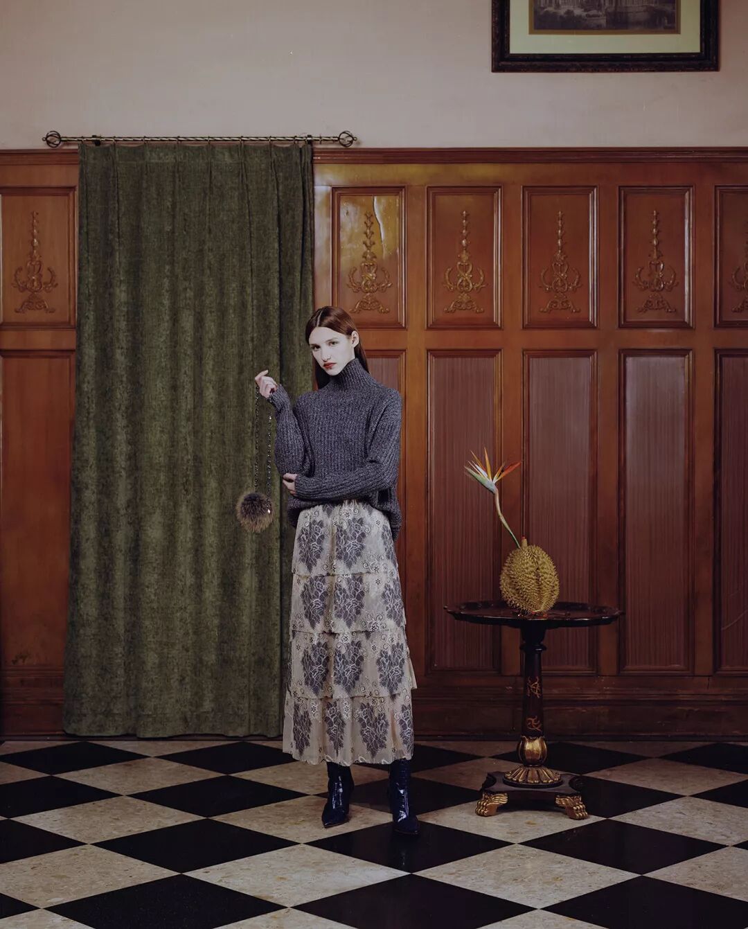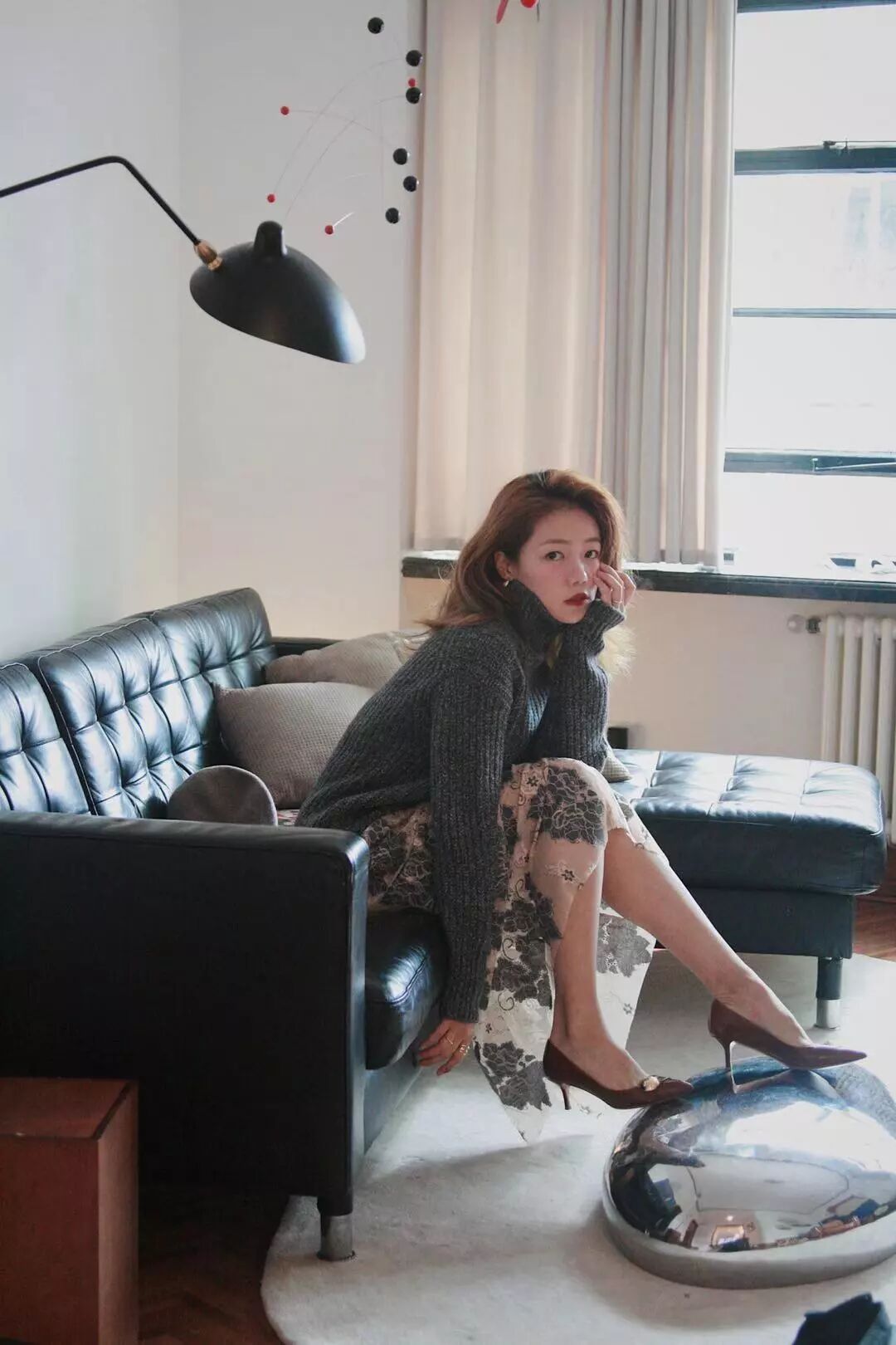 高领套头粗针织毛衣+多层蕾丝蛋糕半裙
