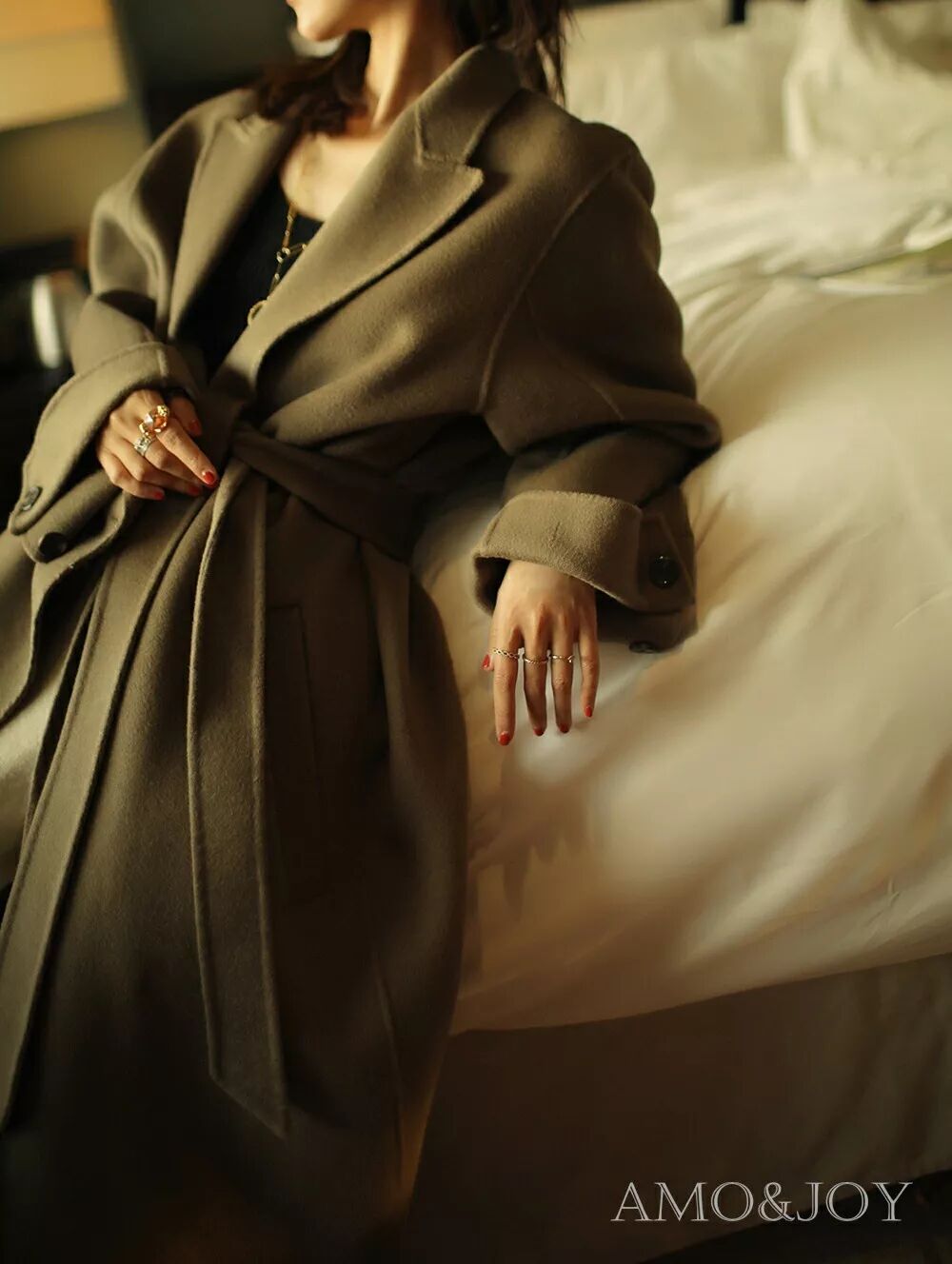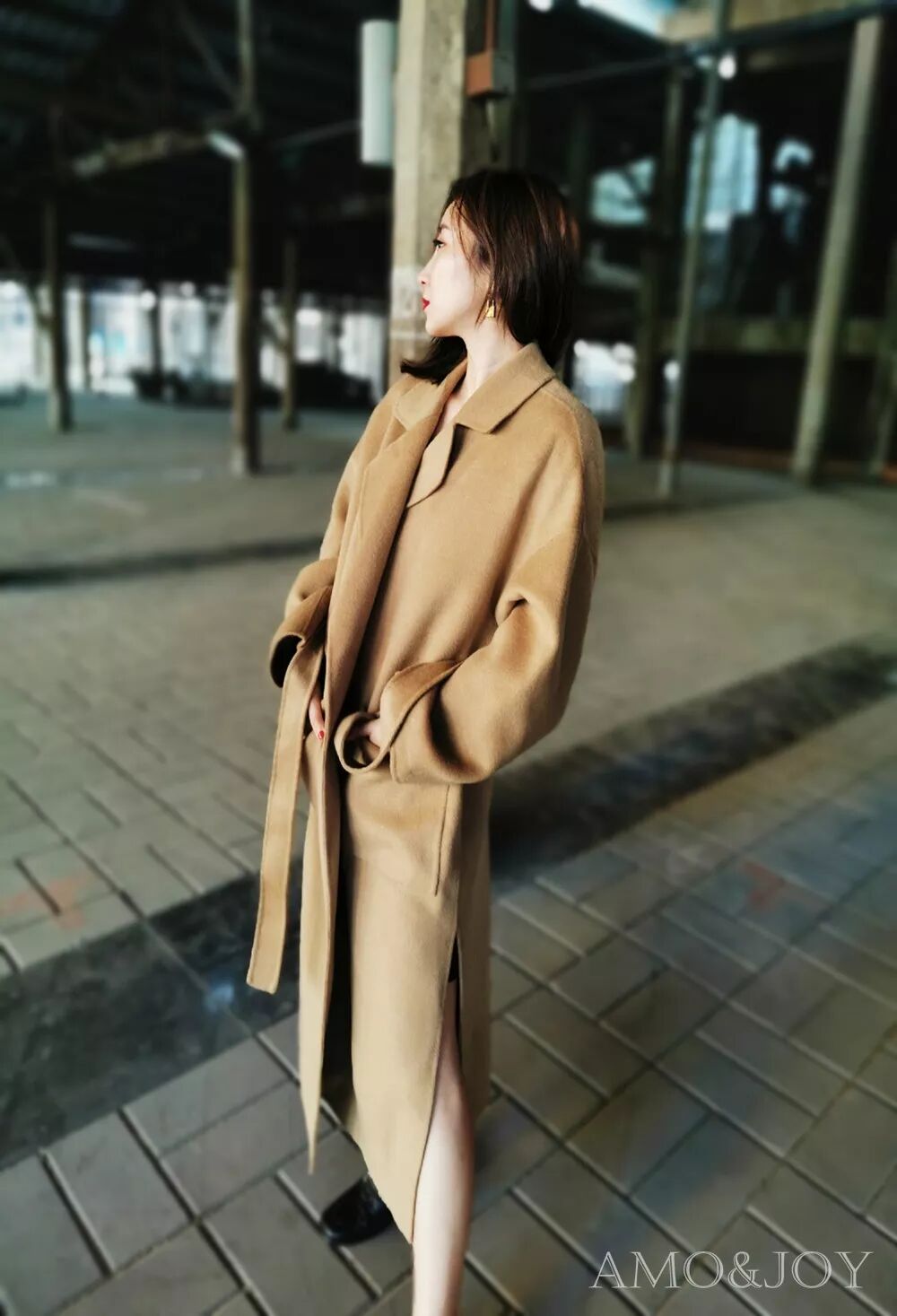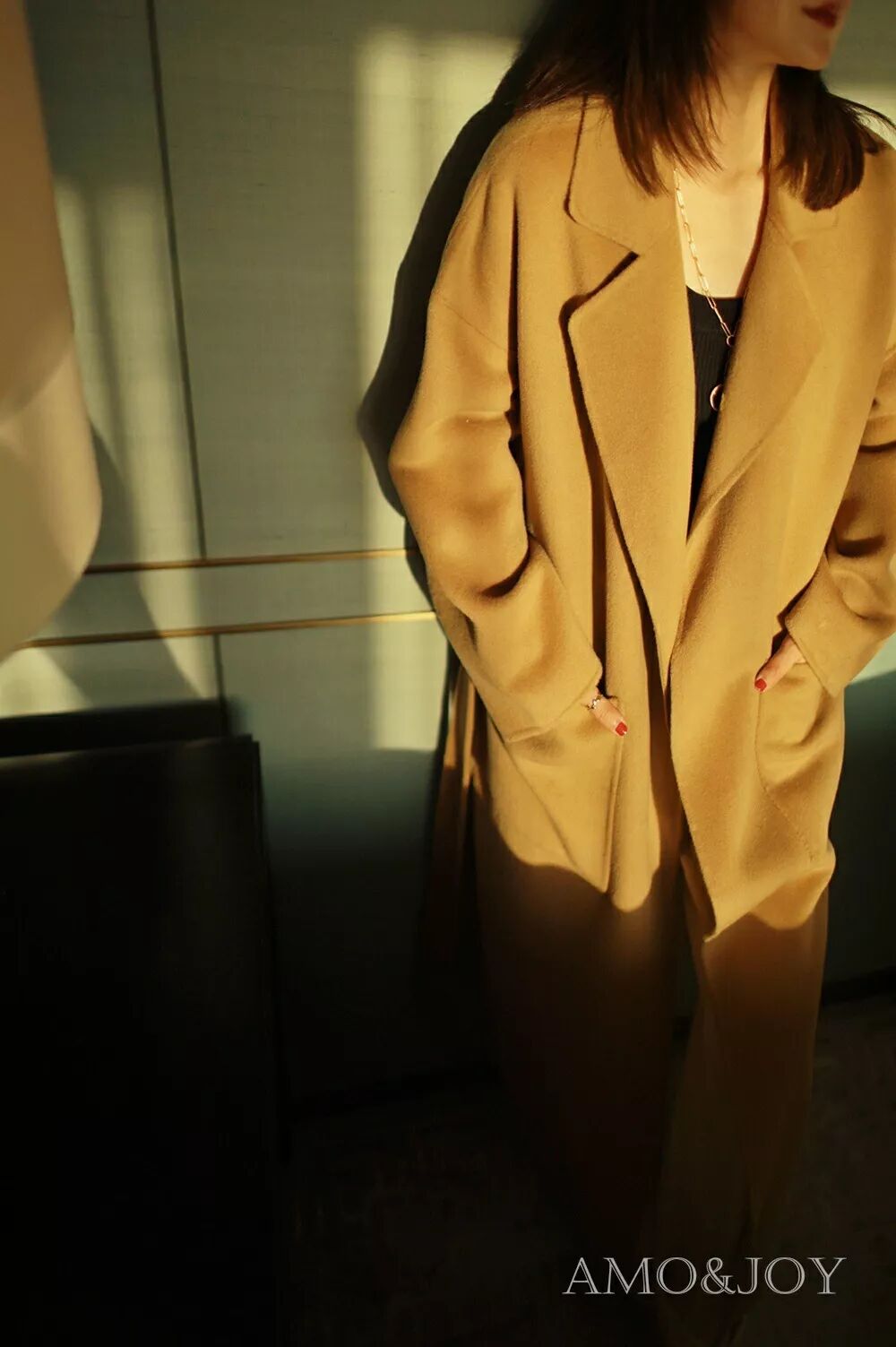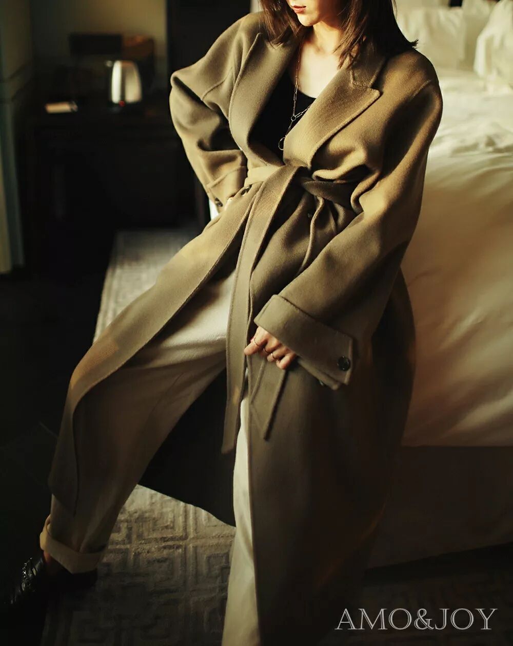 蝙蝠袖双面手缝羊绒长款大衣(可可色)