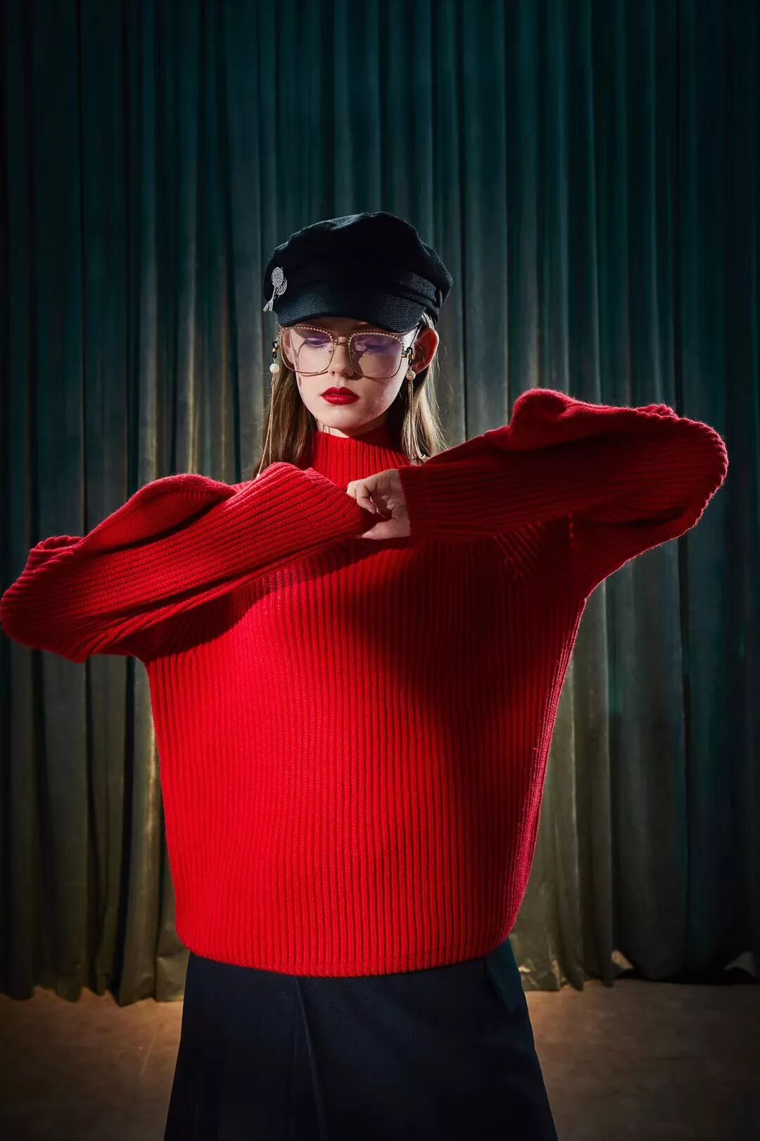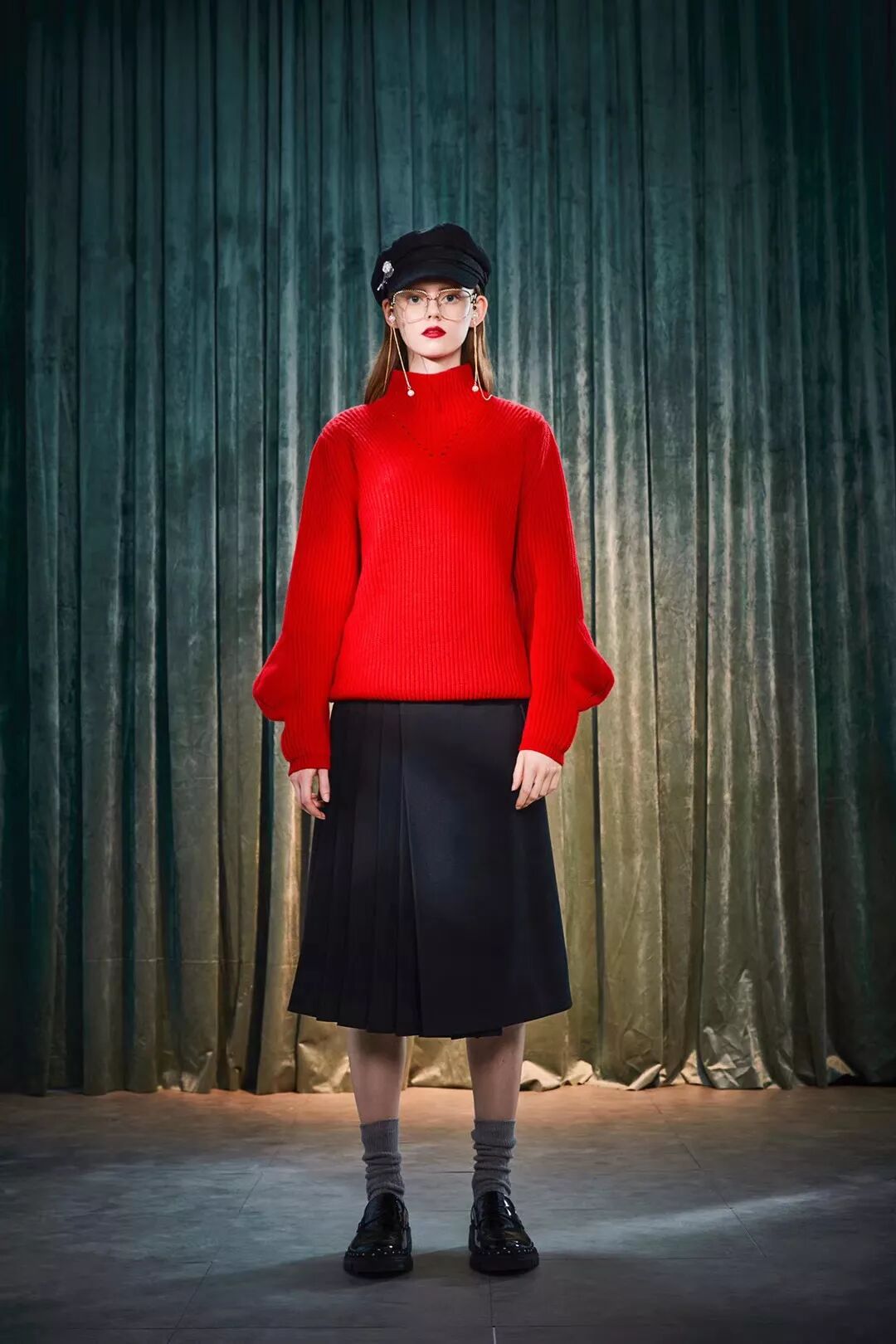 高领粗针织毛衣(大红)+不对称挂链百褶裙