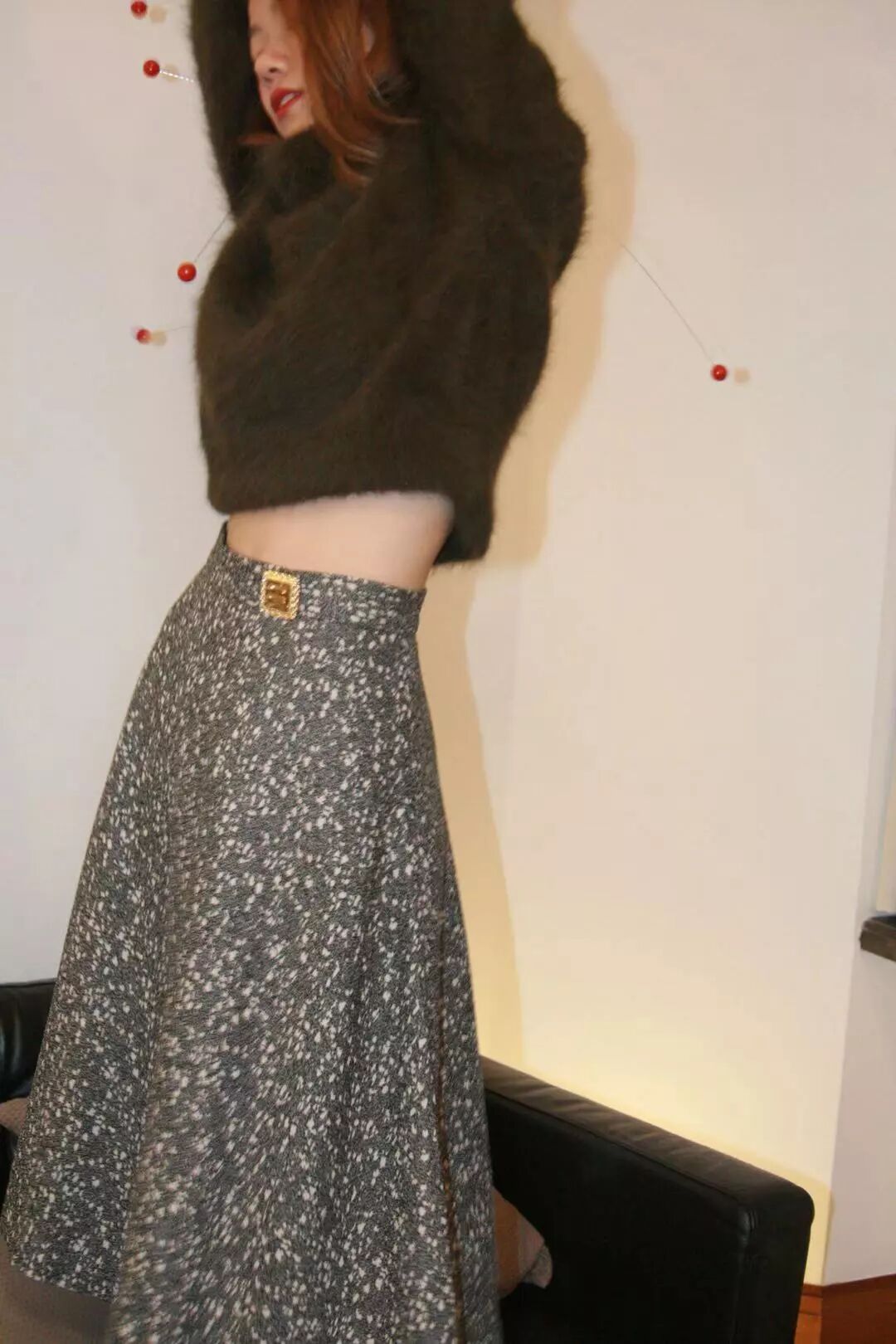 长绒毛兔毛大翻领毛衣+水钻扣装饰分叉半裙