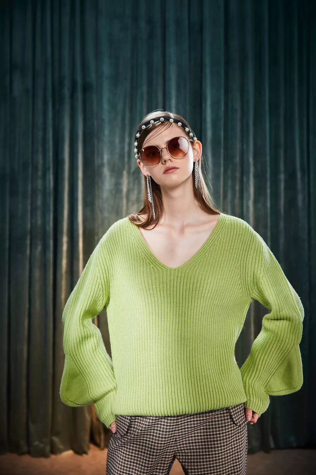 燕麦色小高领粗棒针织撞色拼接牛油果绿大衣