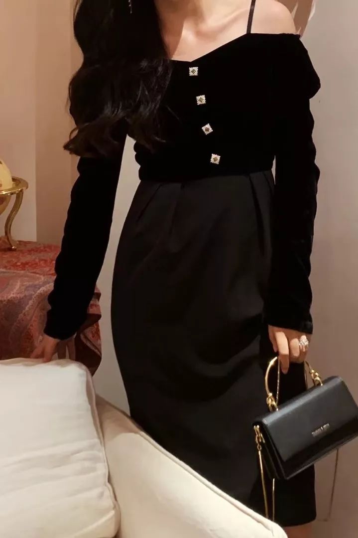 落肩丝绒拼接修身连衣裙