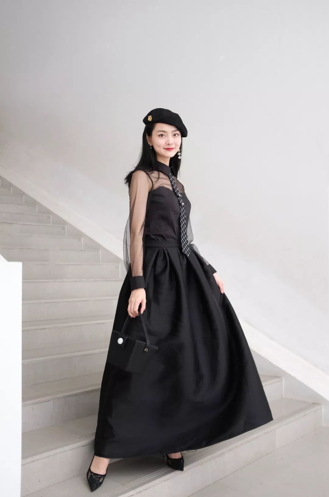 透视拼接领带衬衣+蓬蓬长裙